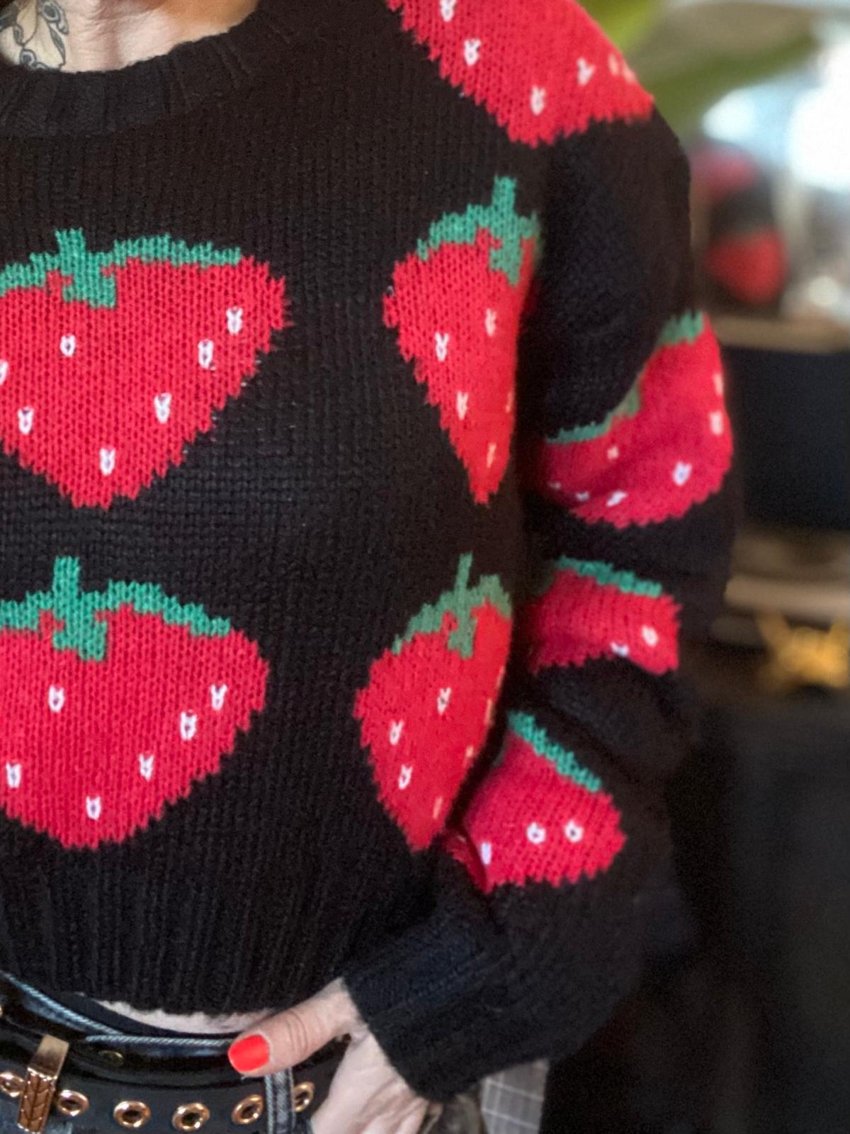 Tu veux un pull qui claque, qui assume ses couleurs et qui dit “oui, je suis cool ET je n’ai pas peur d’attirer les compliments” ? Ce petit bijou est fait pour toi. Son fond noir met parfaitement en valeur de grandes fraises rouge vif, façon pop art, pour un look original, joyeux et un peu impertinent — comme on aime.